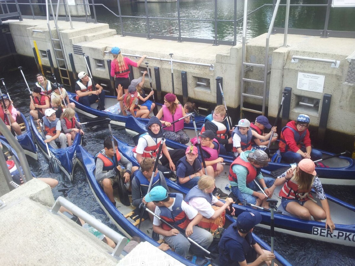 Zum Mittagessen gab es leckeren Linseneintopf mit Wiener. Als nächstes statteten wir uns mit Paddel und Schwimmwesten aus und setzten unsere Kanus aufs Wasser.